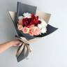 Яркий и привлекательны микс из красных тюльпанов в шикарном обрамлении из персиковых кустовых роз и белоснежных хризантем идеально подойдет в качестве презента для изысканных гурманок. Элегантная и стильная упаковка из крафтовой бумаги темного и светлого оттенка серого цвета идеально дополняет оригинальную авторскую аранжировку. Милый бантик из атласной ленты завершает эффектную композицию.